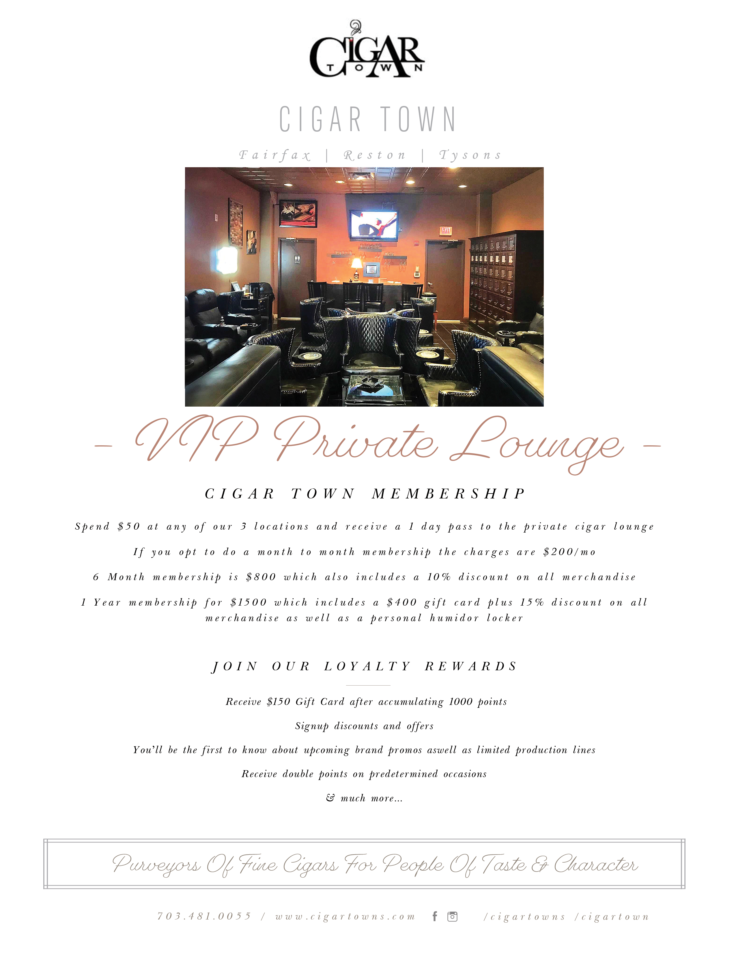 Cigar Town in Reston Town Center and Franklin Farm have cigar lounges for you to enjoy a cigar in comfort. Our state-of-the-art lounges are equipped with theater-style seating, numerous flat-screen TVs, and upscale decor and ambient lighting give the space a warm and inviting atmosphere. Clients can experience our lounges on a day-pass (minimum purchase required) or through a recurring membership. Membership includes use of a personal locker or humidor in the lounge, discounts on merchandise, exclusive promotions, wi-fi internet access and soft beverages. Inquire about membership rates.
