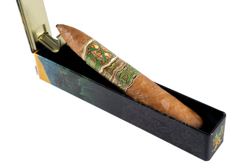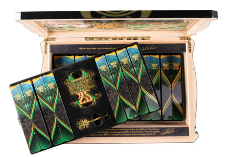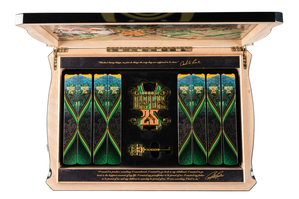 Presentation is nothing short of art. Each cigar is encased in an individually crafted metal coffin with an ingenious flip-top lid and lift mechanism, all housed in an opulent 20ct humidor display box complete with a removable tray and integrated space for a Boveda humidification system. Also included with the humidor are an OpusX 25 medallion and a large key that will serve a special purpose in the future according to Carlos “Carlito” Fuente Jr.